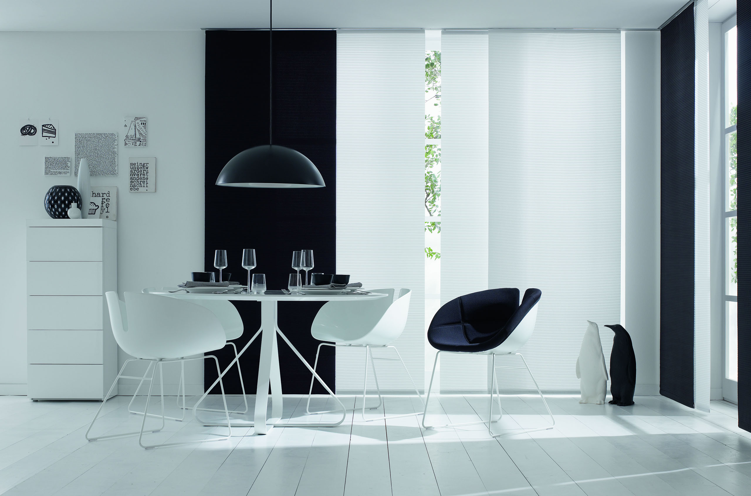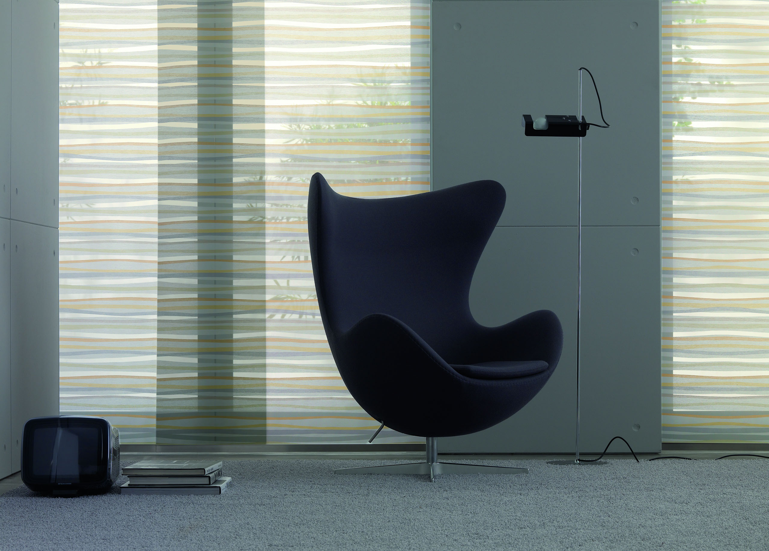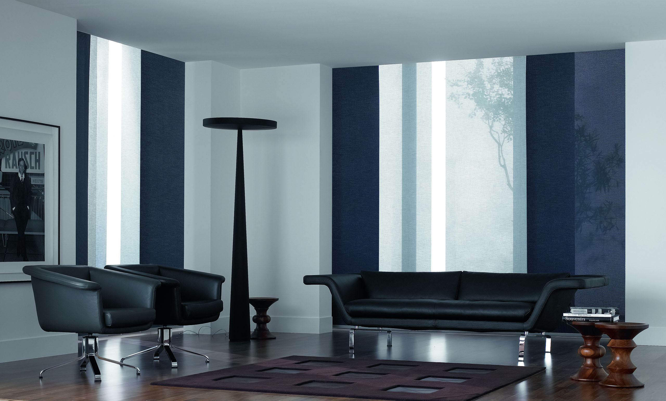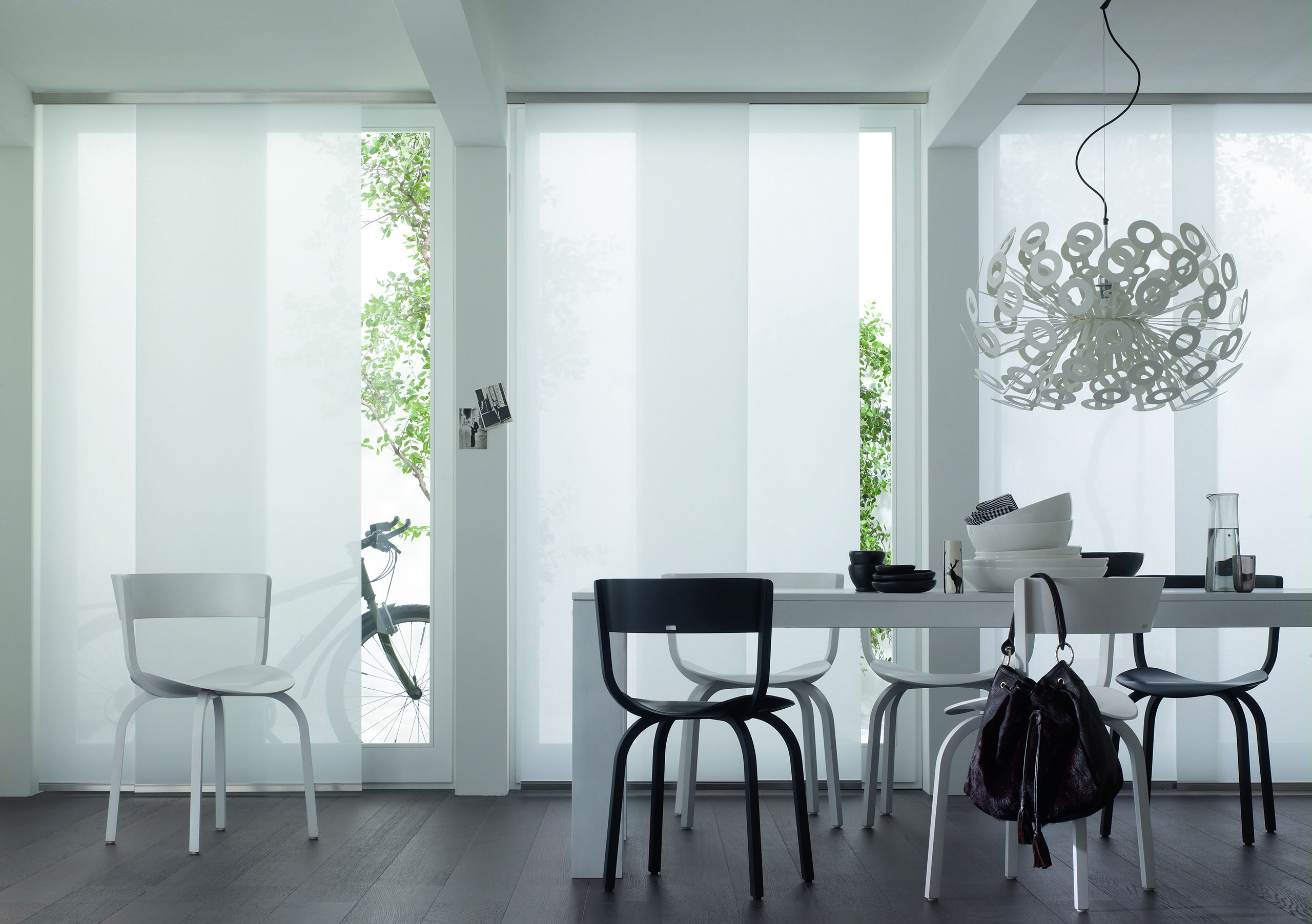 Eine reduzierte und puristische Inneneinrichtung ergänzen Flächenvorhänge perfekt. Besonders gut eignen sie sich für bodentiefe Fenster und große Fensterfronten, um den dort vorhandenen Lichteinfall zu dosieren.